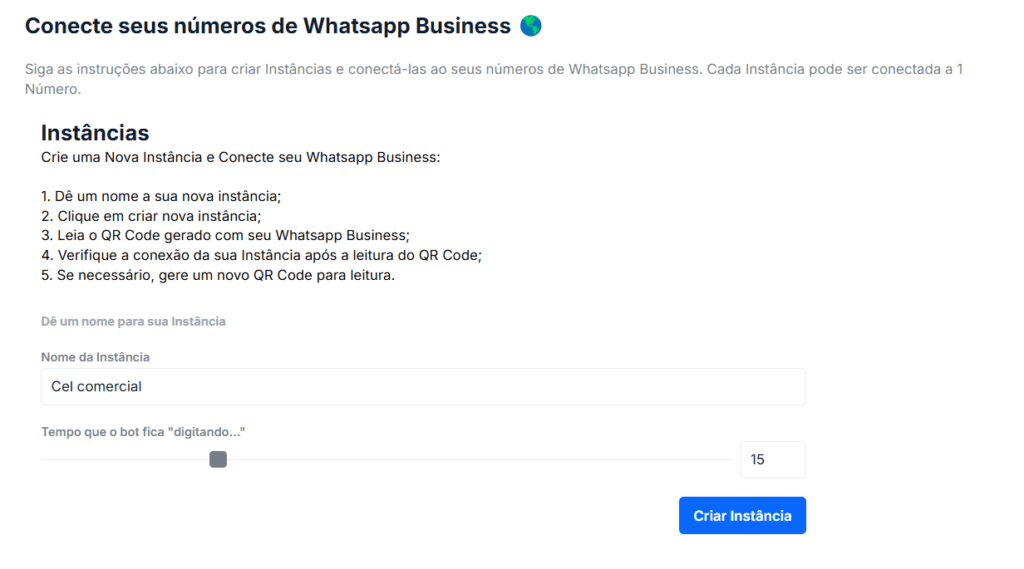 A seguir veja como criar uma nova Instância, essa Instância será posteriormente conectada ao seu número de Whatsapp.